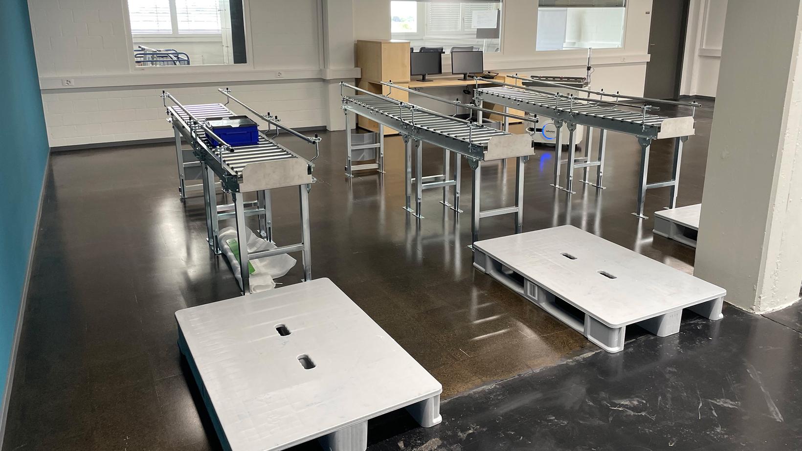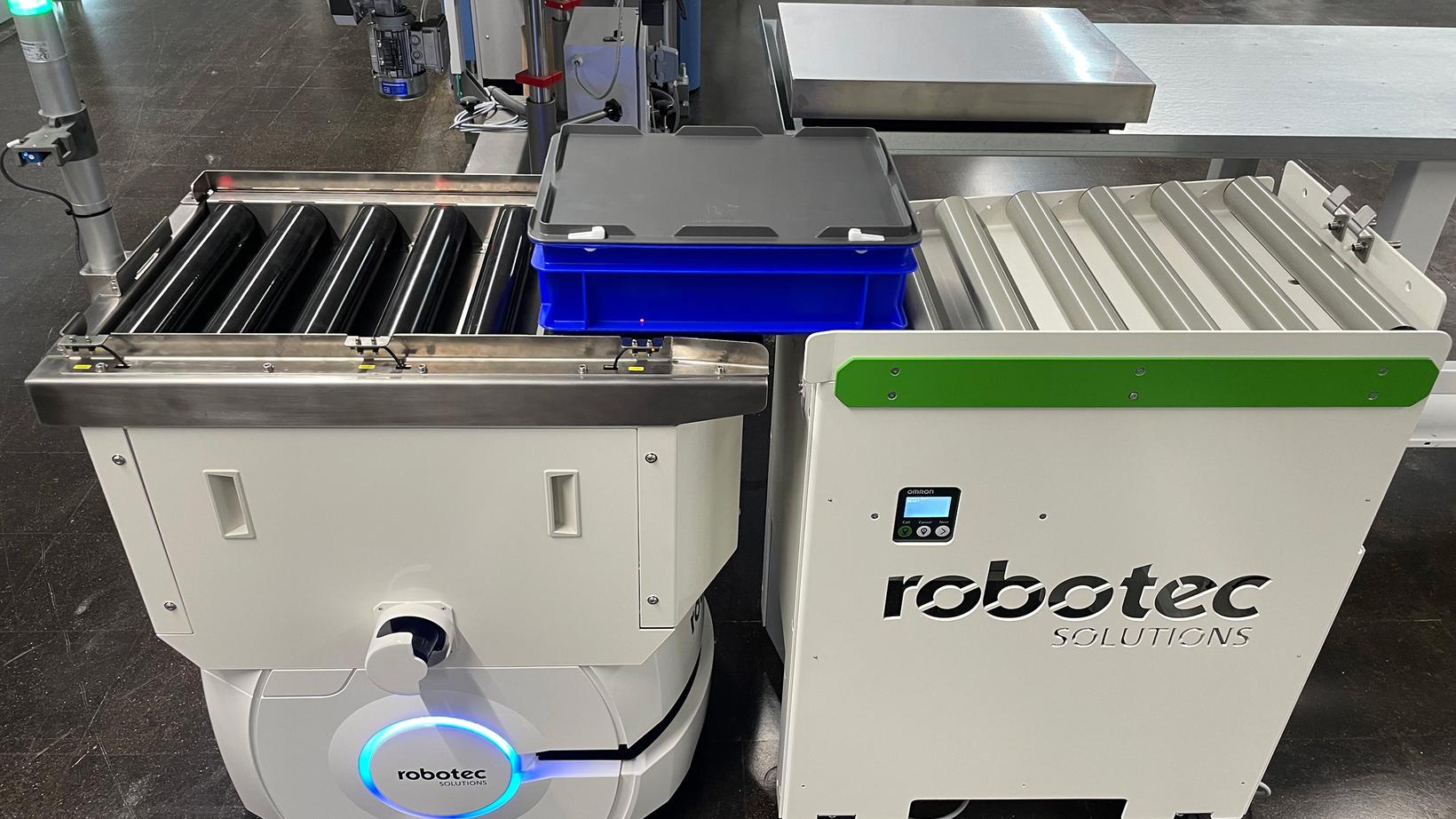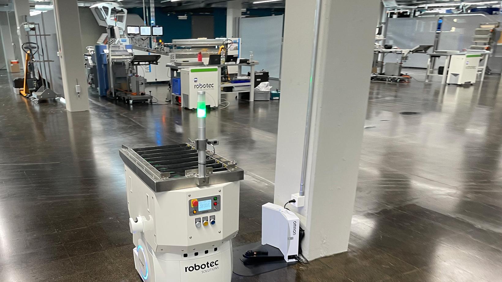 Mit unserer Lösung – basierend auf dem autonomen mobilen Robotersystem LD-90 von OMRON und einem aufgebauten Förderbandsystem von Robotec – setzten wir diese Vorgaben um. Bei jeder der fünf Maschinen installierten wir eine Transferstation.