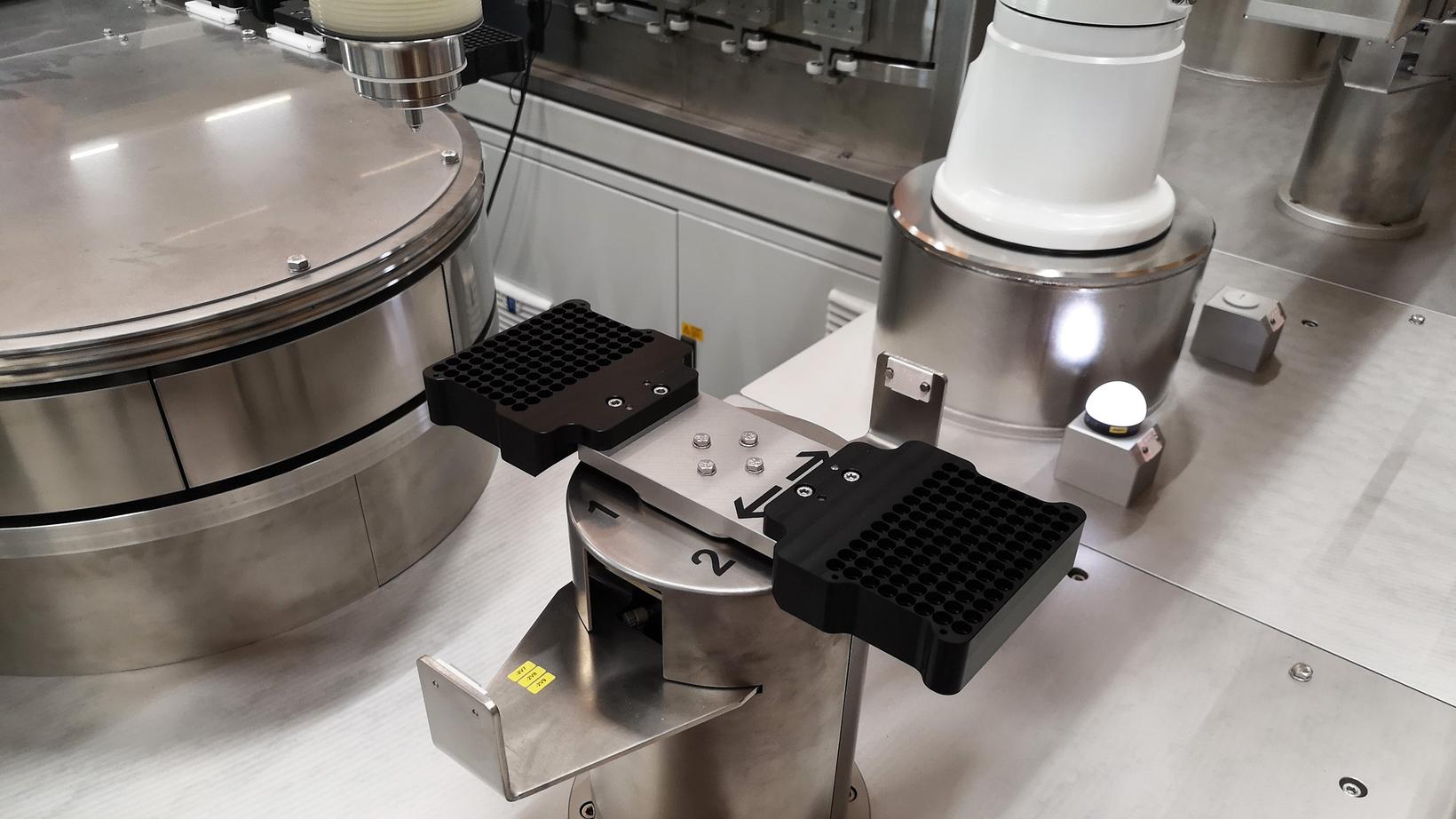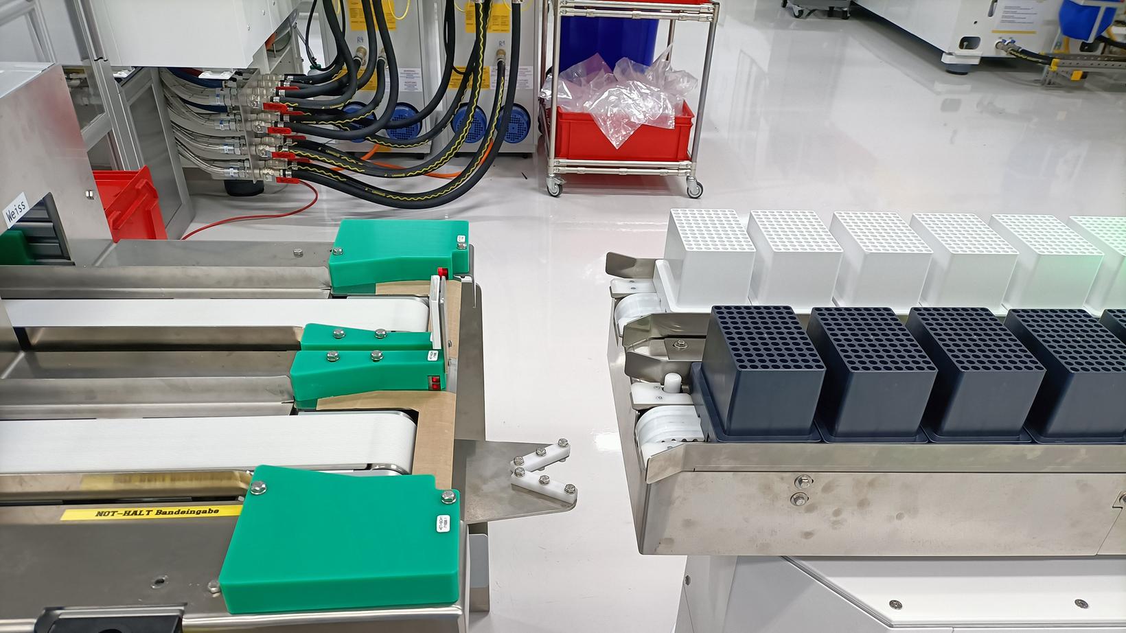 Die Anlage verarbeitet simultan zwei Arten von Pipettenspitzen, die anschliessend gemeinsam in ein Rack verpackt werden. Die Spitzen werden dazu durch einen Sauggreifer vom Förderband auf Magnetshuttles platziert. Diese erhalten die Information, auf welchem Platz welche Kavität liegt und durchfahren die folgenden Stationen: