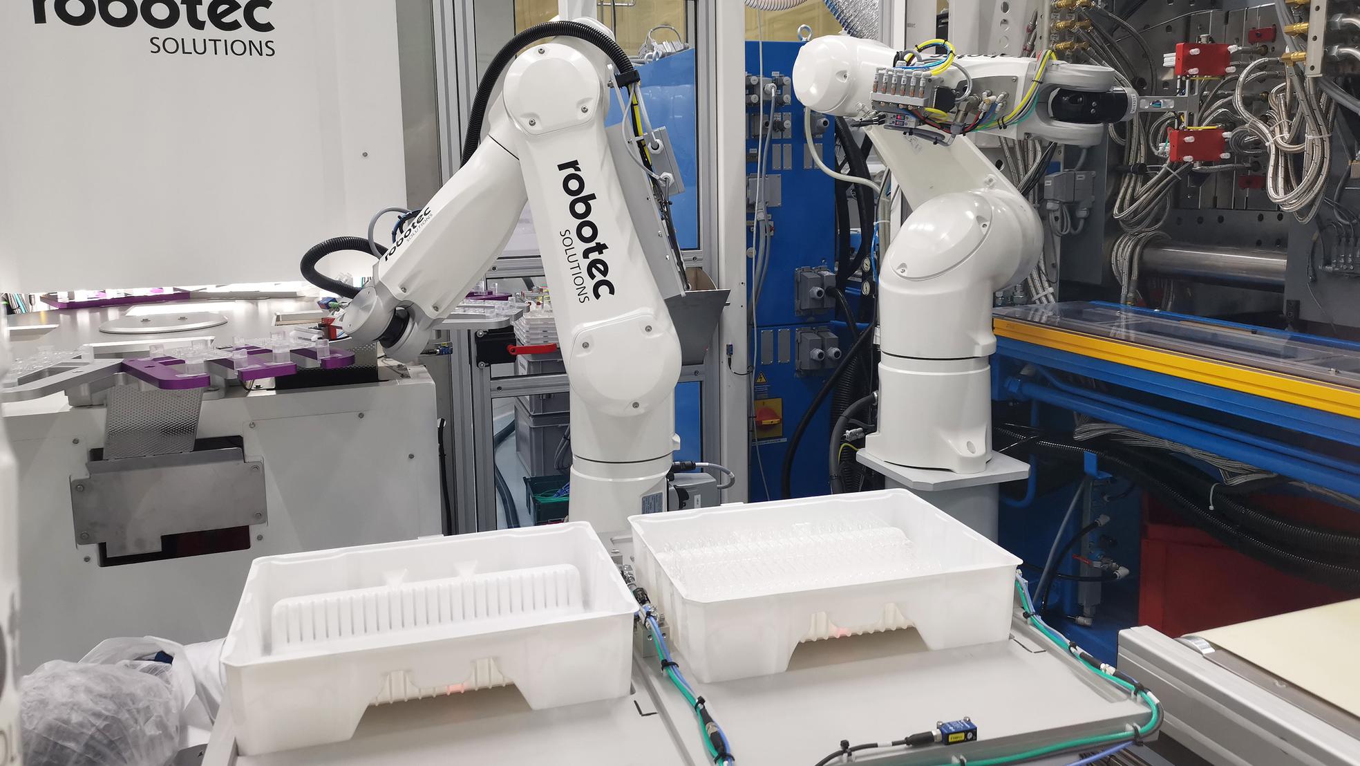 Automatisieren Sie mit Robotec Handling und Montage von Spritzgussteilen. Mit unseren intelligenten Automatisierungslösungen lassen sich Bauteile effizient entnehmen, montieren und prüfen – für maximale Präzision, Prozesssicherheit und Qualität in der Spritzguss-Fertigung, auch bei hohen Stückzahlen, kurzen Zykluszeiten oder im Reinraum.